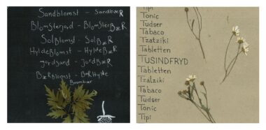 To eksempler på de lærerstuderendes leg med planter og poesi. ”Naturen rummer jo de mest vidunderlige navne, hvis man er et lille lyrikmonster som mig!" lyder det fra deres underviser Caroline Mathilde Qvarfot, lektor på KP. Foto: Caroline Mathilde Qvarfot