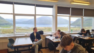 Ét af deres stop var på Kambsdal College, et gymnasie i den lille bygd Kambsdalur i det nordlige Færøerne. Her går omkring 500 elever, og ligesom hjemme i Odense fletter lærerne bæredygtighed ind i alle fag, hvor det giver mening – bare i en færøsk kontekst.