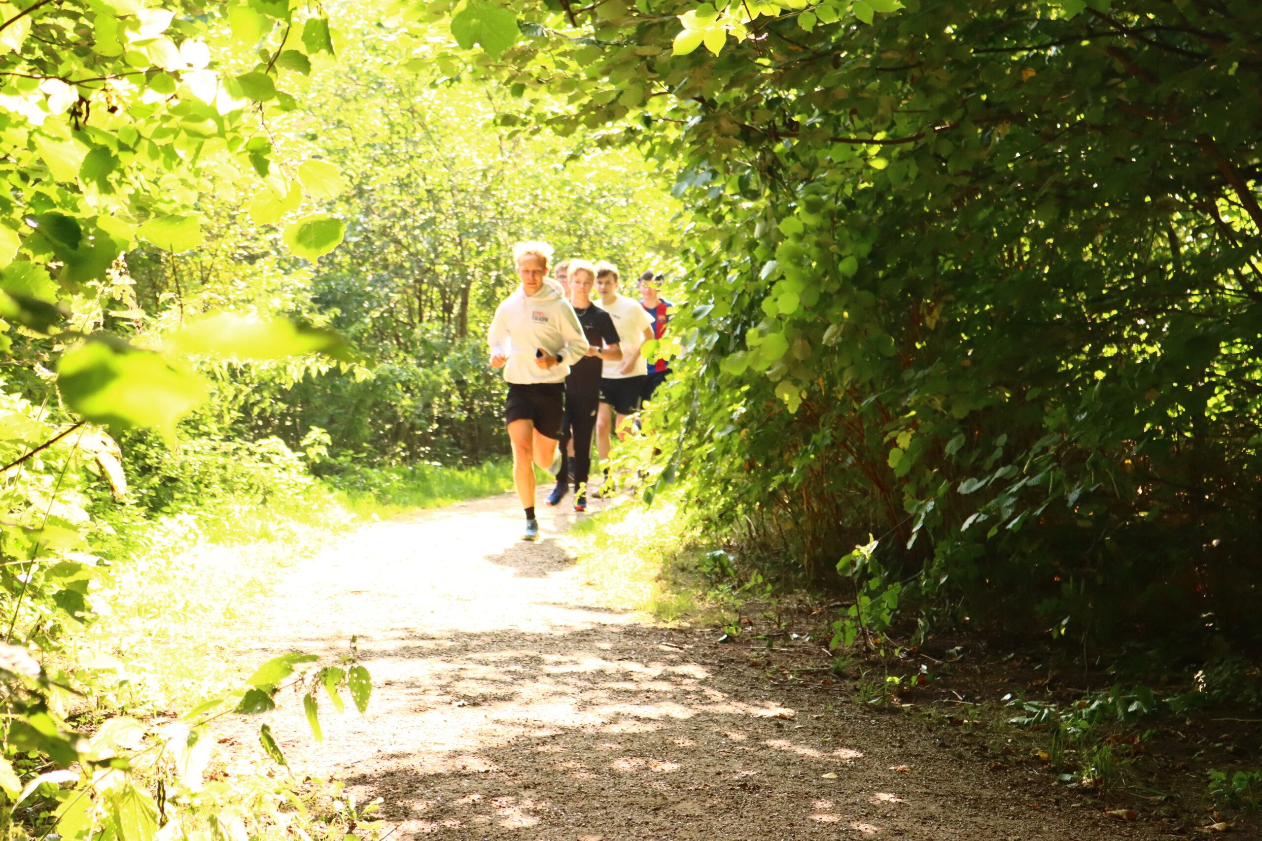 På Svendborg Erhvervsskole & Gymnasier har de integreret bæredygtighed i al undervisning. Her er en gruppe elever på løbetur i naturen til gymnasiernes klimahandledag. Foto: Svendborg Erhvervsskole & Gymnasier
